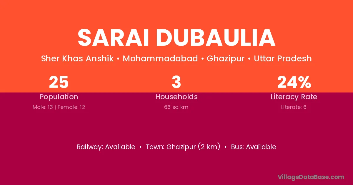 Ghazipur (2 km) is the nearest town to Sarai Dubaulia village for major economic activities and is located approximately 2 km away.