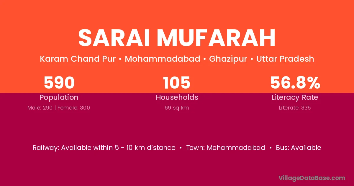 Sarai Mufarah village has a total population of 590 people, of which 290 are males and 300 are females.