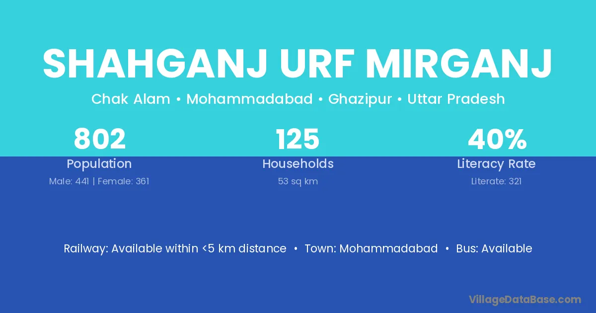 Shahganj Urf Mirganj village has a total population of 802 people, of which 441 are males and 361 are females.