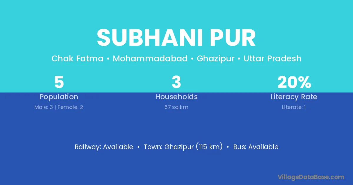 Ghazipur (115 km) is the nearest town to Subhani Pur village for major economic activities and is located approximately 115 km away.