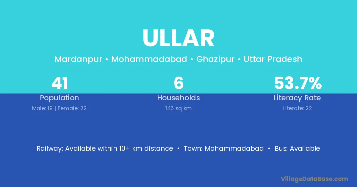 The literacy rate of Ullar village is 53.66%. Male literacy stands at 57.89% and female literacy at 50.00%.