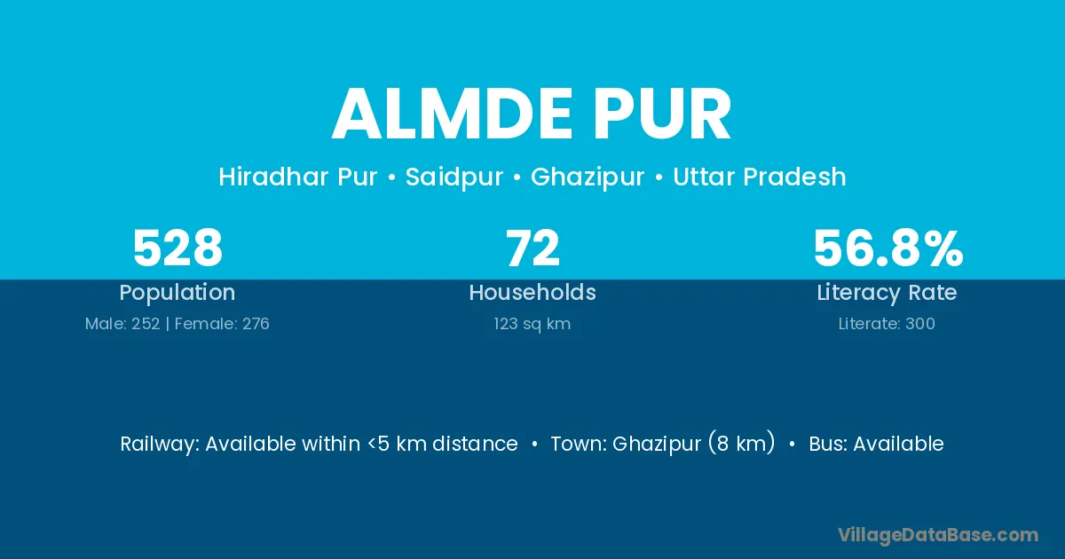 Ghazipur (8 km) is the nearest town to Almde Pur village for major economic activities and is located approximately 8 km away.