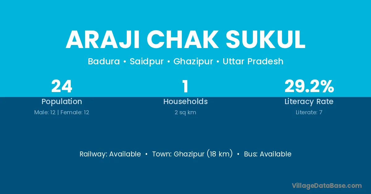 Ghazipur (18 km) is the nearest town to Araji Chak Sukul village for major economic activities and is located approximately 18 km away.