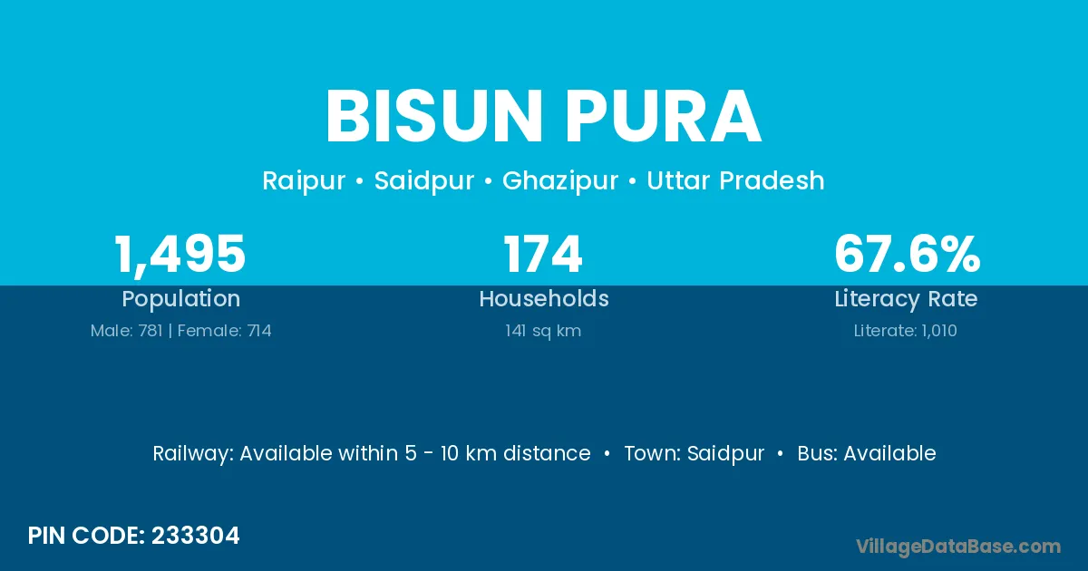 Bisun Pura village has a total population of 1,495 people, of which 781 are males and 714 are females.