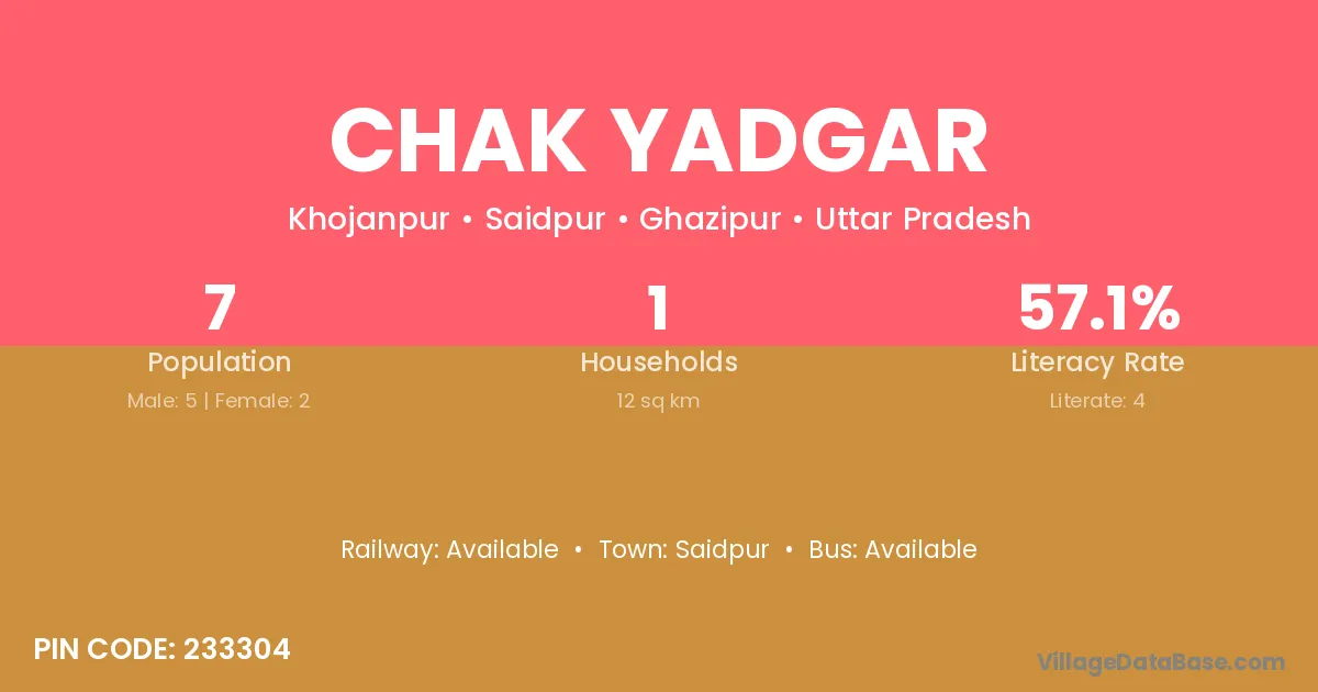 Chak Yadgar village has a total population of 7 people, of which 5 are males and 2 are females.