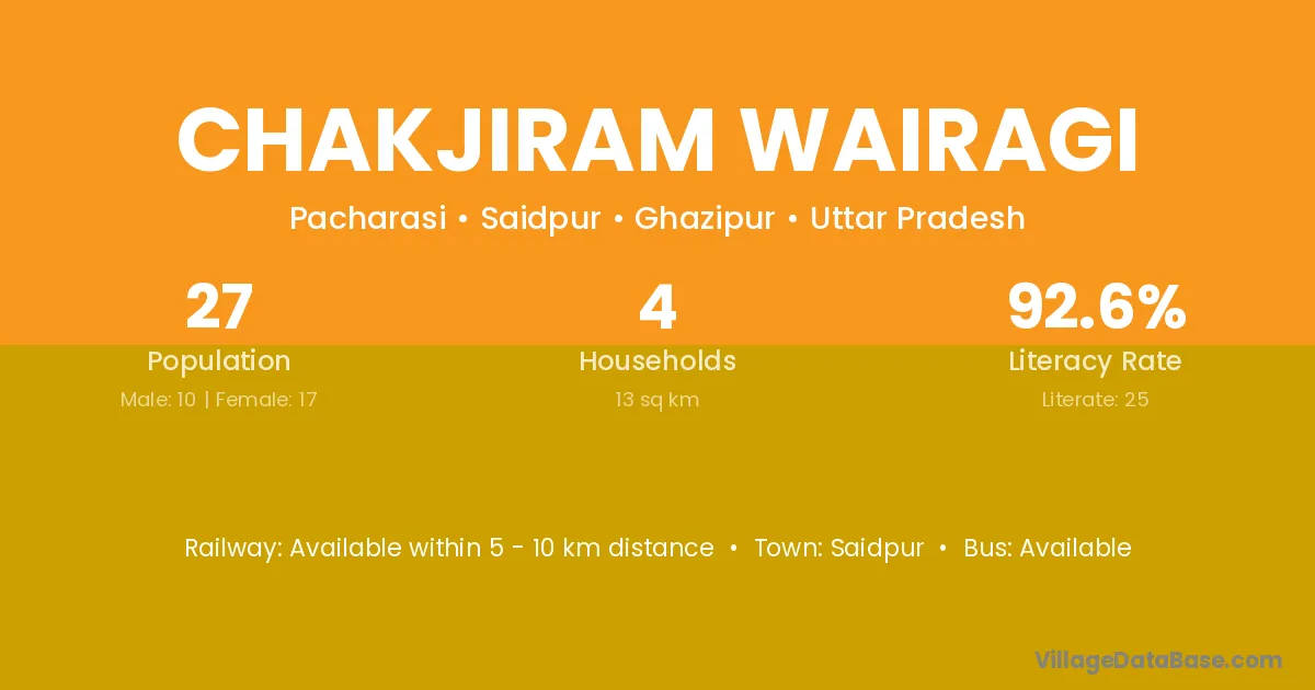 Chakjiram Wairagi village has a total population of 27 people, of which 10 are males and 17 are females.