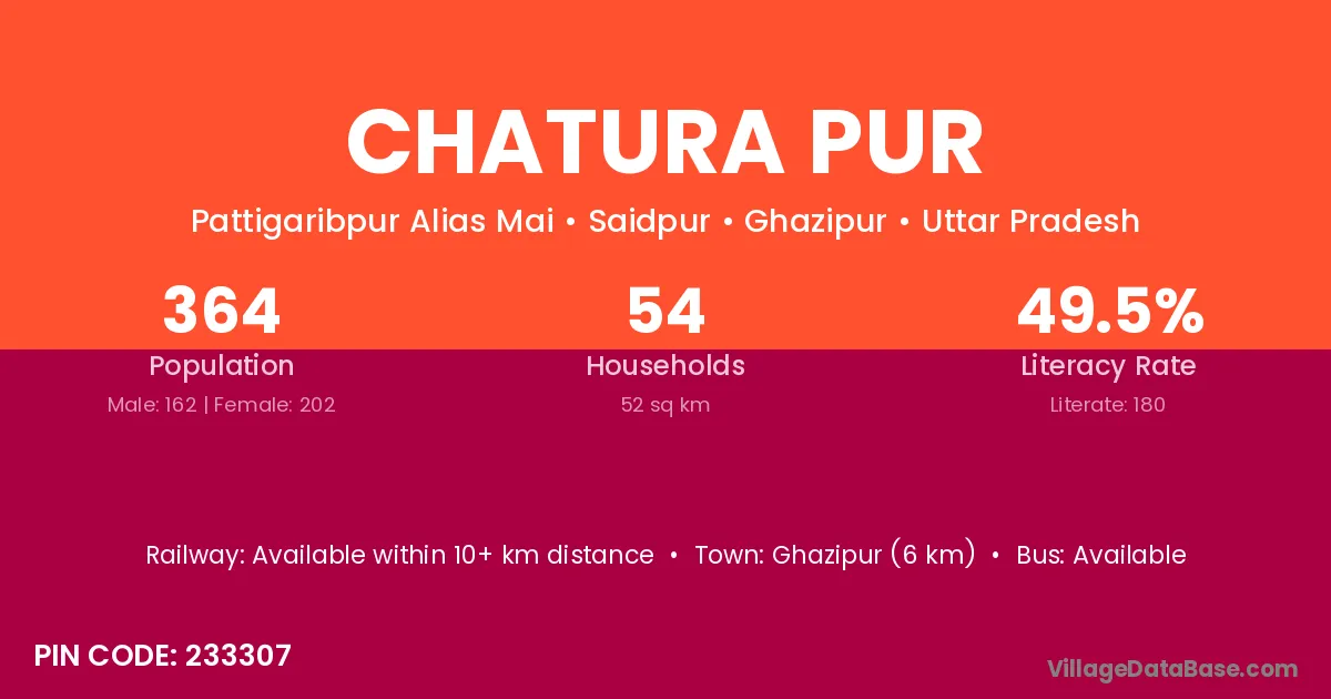 Ghazipur (6 km) is the nearest town to Chatura Pur village for major economic activities and is located approximately 6 km away.