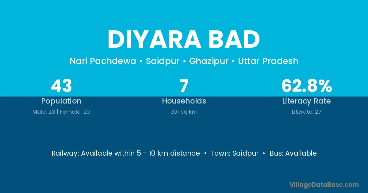 Diyara Bad village has a total population of 43 people, of which 23 are males and 20 are females.