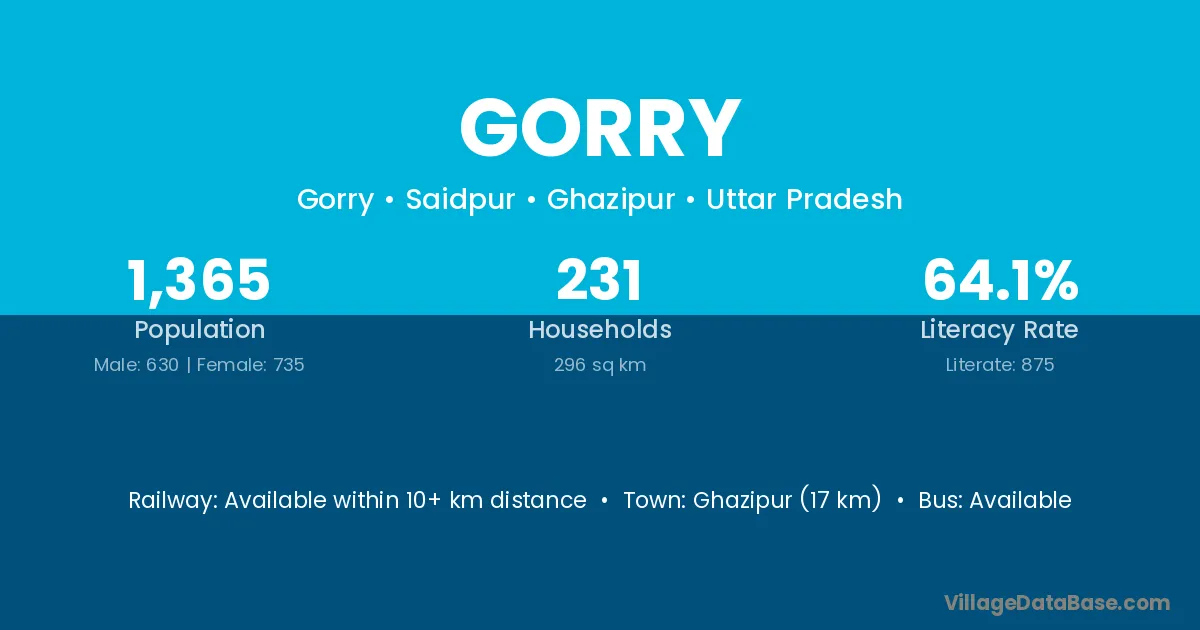 Ghazipur (17 km) is the nearest town to Gorry village for major economic activities and is located approximately 17 km away.