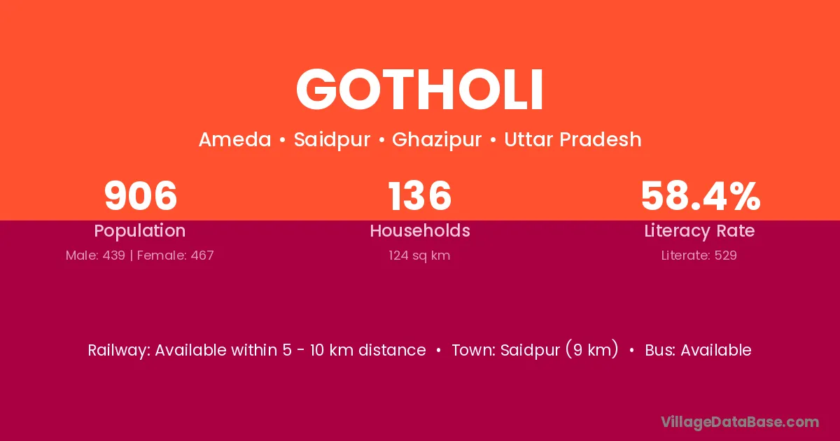 Saidpur (9 km) is the nearest town to Gotholi village for major economic activities and is located approximately 9 km away.