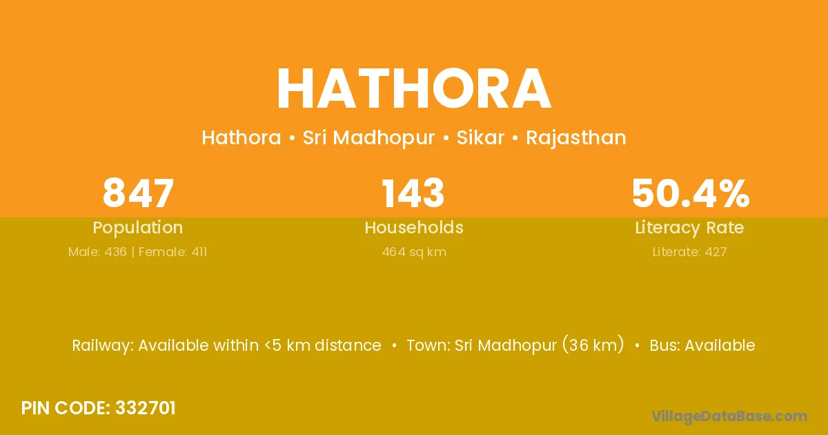 The literacy rate of Hathora village is 66.89%. Male literacy stands at 77.74% and female literacy at 56.42%.