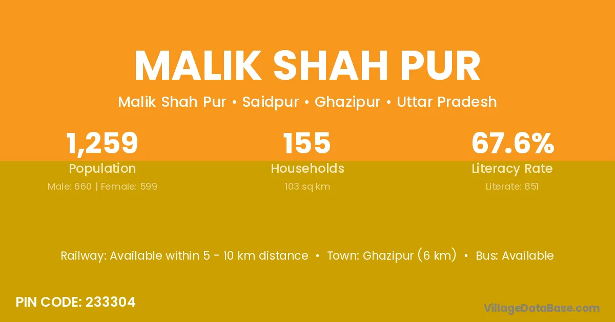 Ghazipur (6 km) is the nearest town to Malik Shah Pur village for major economic activities and is located approximately 6 km away.