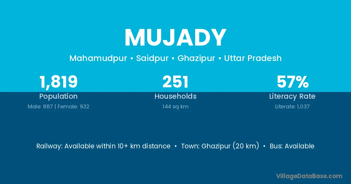 Ghazipur (20 km) is the nearest town to Mujady village for major economic activities and is located approximately 20 km away.