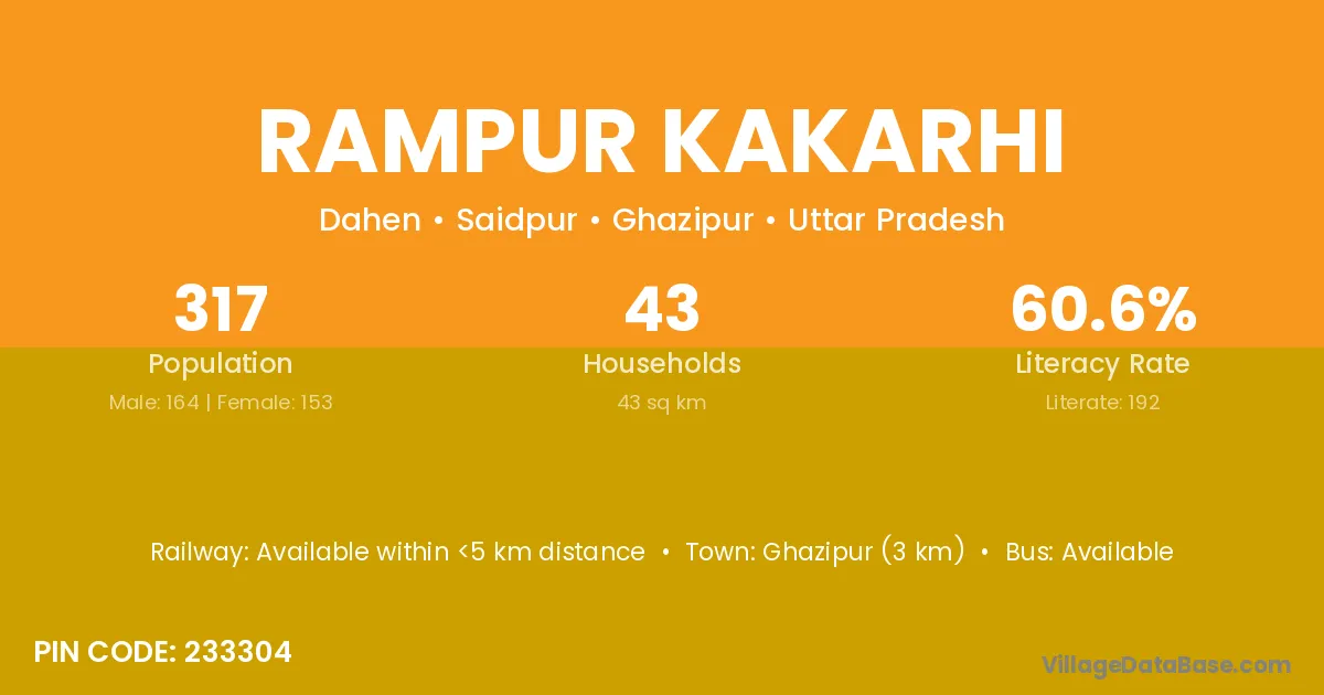 Ghazipur (3 km) is the nearest town to Rampur Kakarhi village for major economic activities and is located approximately 3 km away.