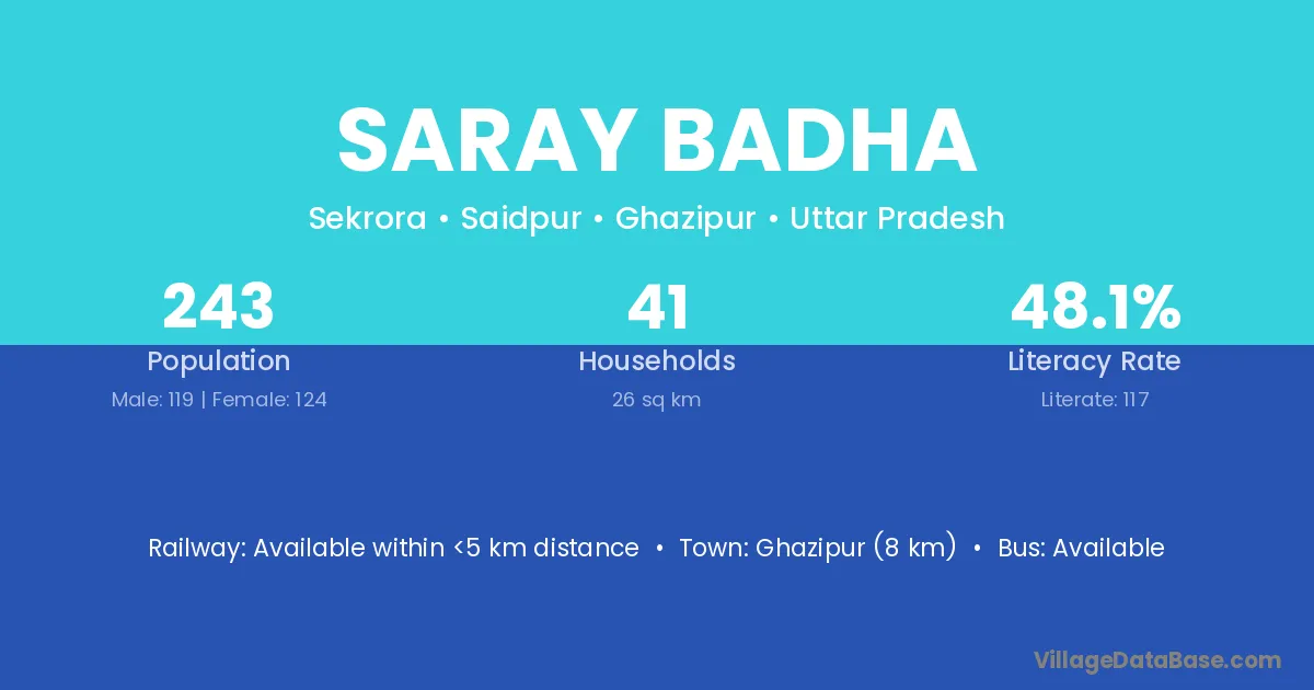 Ghazipur (8 km) is the nearest town to Saray Badha village for major economic activities and is located approximately 8 km away.