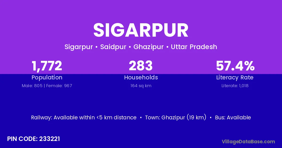 Ghazipur (19 km) is the nearest town to Sigarpur village for major economic activities and is located approximately 19 km away.