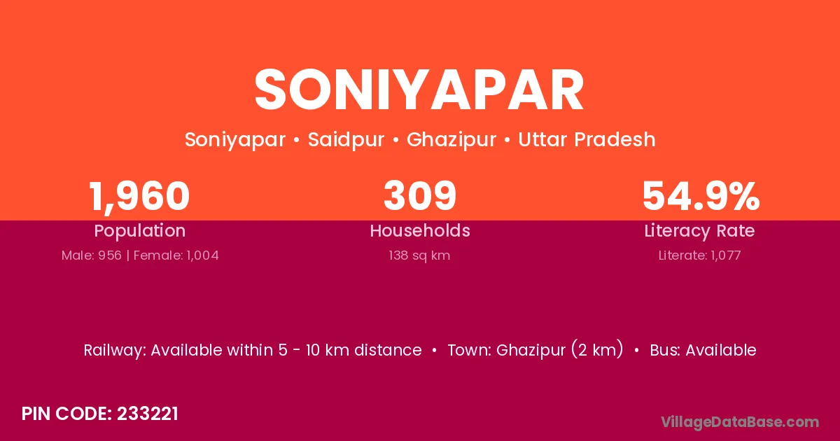 Ghazipur (2 km) is the nearest town to Soniyapar village for major economic activities and is located approximately 2 km away.