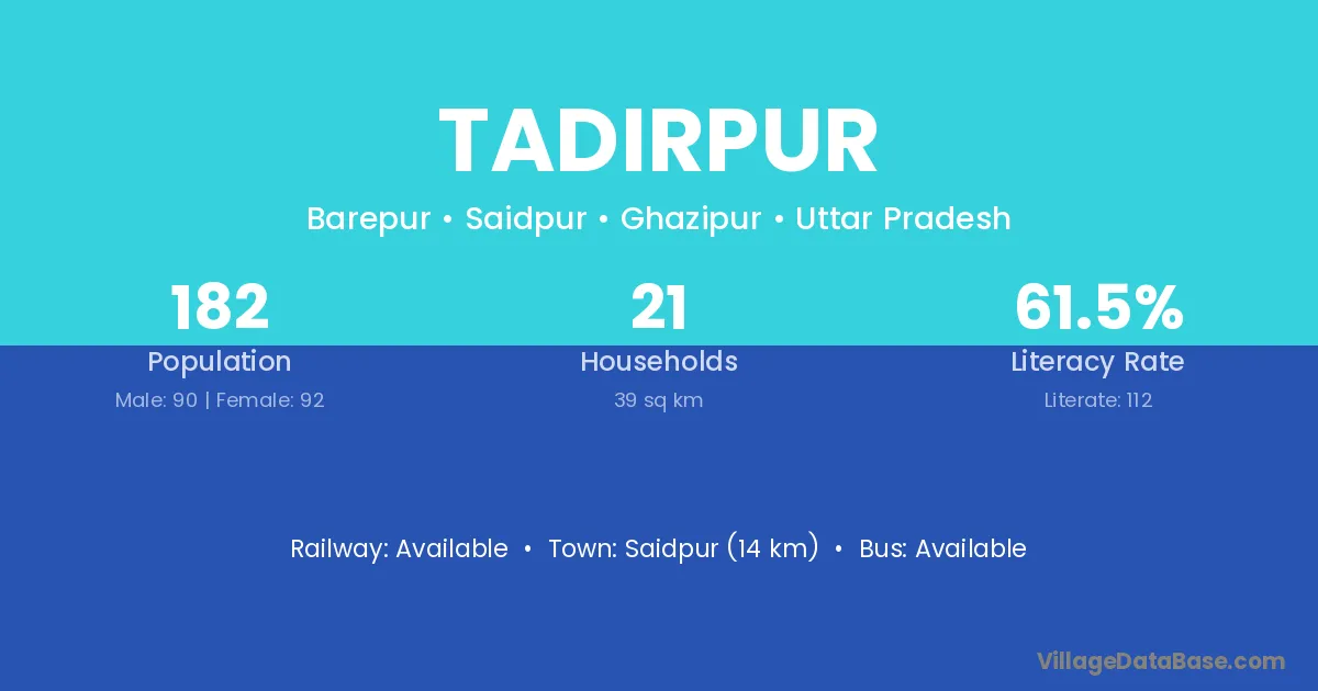 Saidpur (14 km) is the nearest town to Tadirpur village for major economic activities and is located approximately 14 km away.