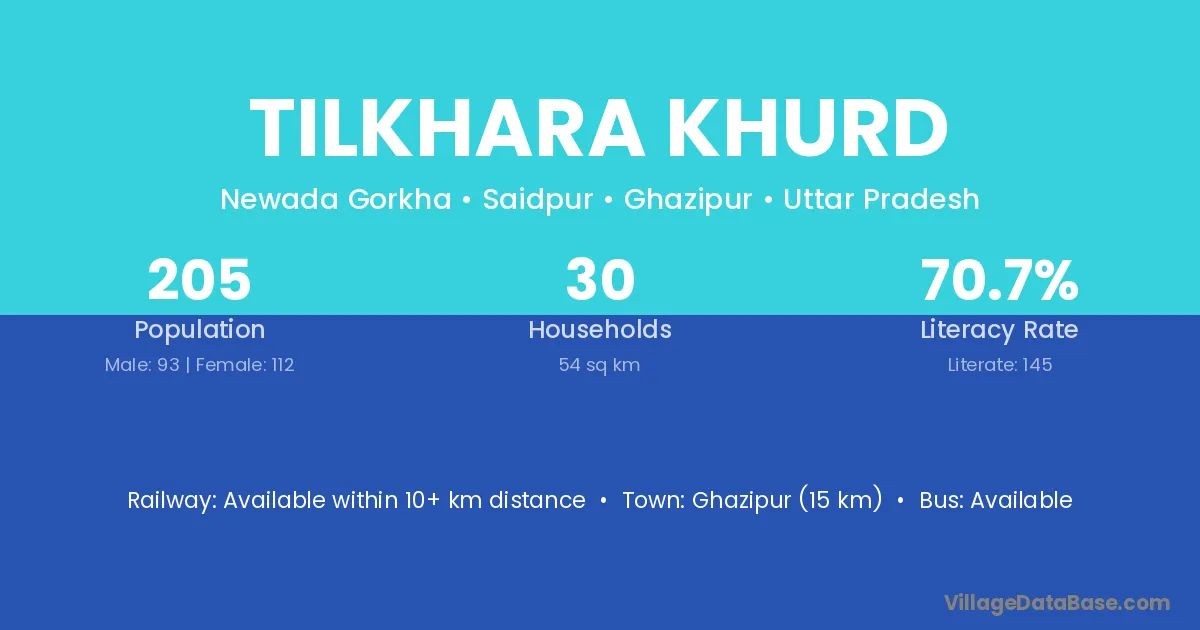 Ghazipur (15 km) is the nearest town to Tilkhara Khurd village for major economic activities and is located approximately 15 km away.