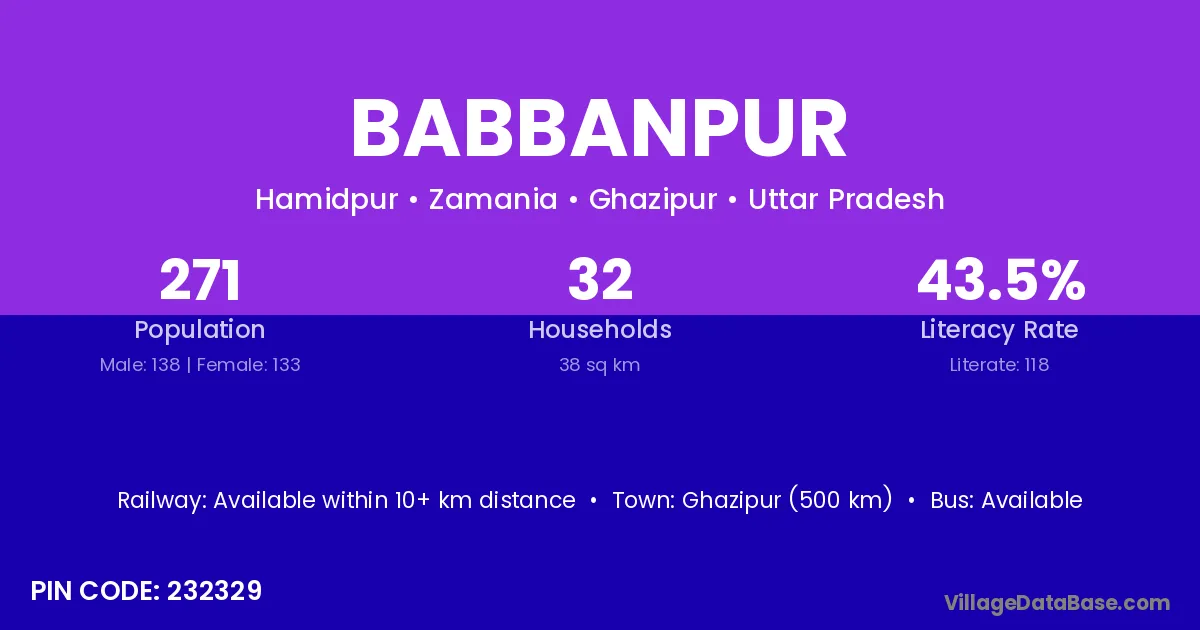 Ghazipur (500 km) is the nearest town to Babbanpur village for major economic activities and is located approximately 500 km away.