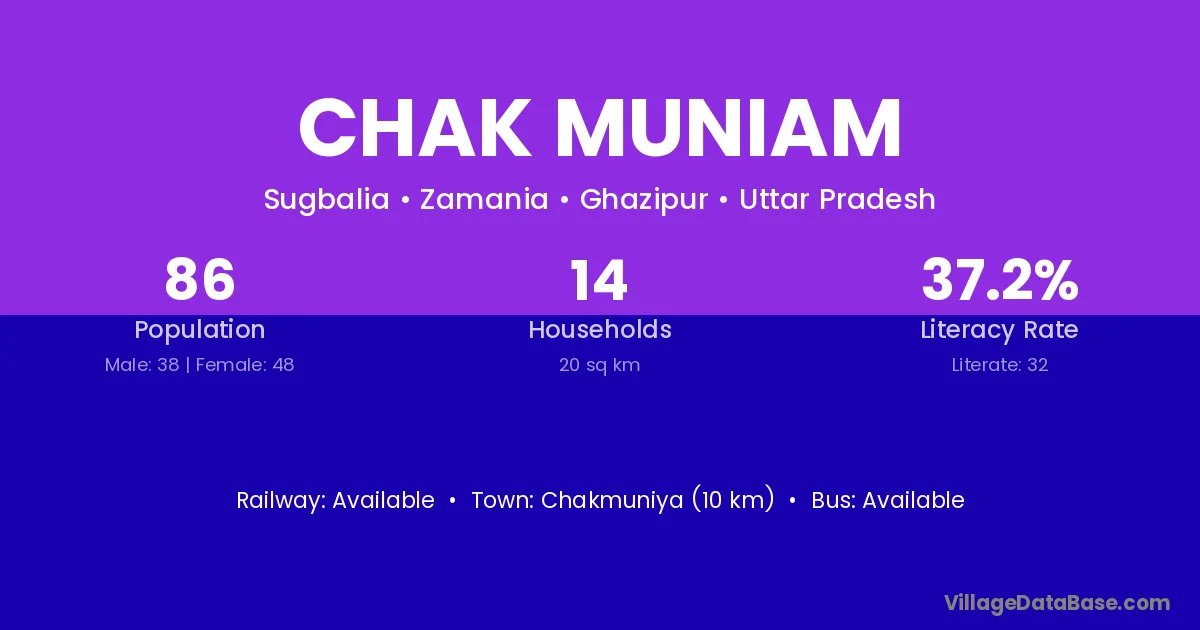 Chakmuniya (10 km) is the nearest town to Chak Muniam village for major economic activities and is located approximately 10 km away.