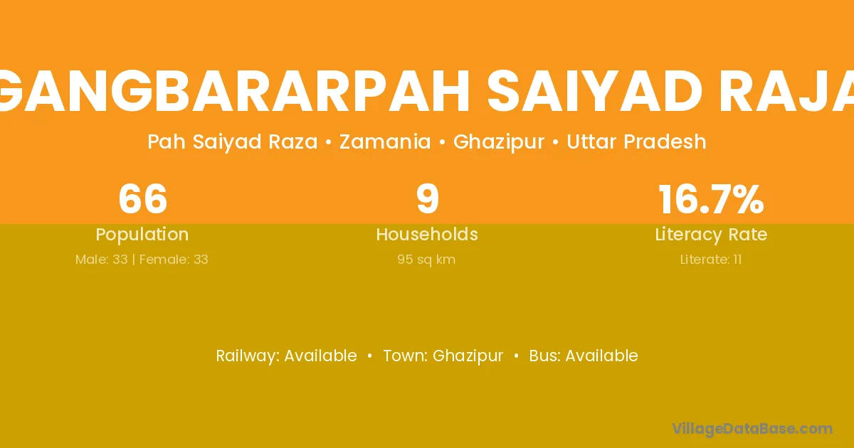 Gangbararpah Saiyad Raja village has a total population of 66 people, of which 33 are males and 33 are females.