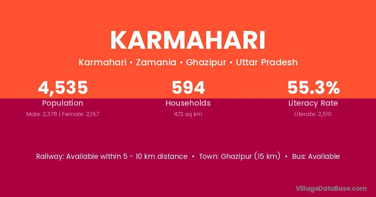 Ghazipur (15 km) is the nearest town to Karmahari village for major economic activities and is located approximately 15 km away.
