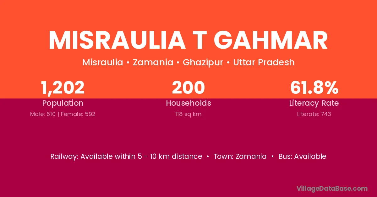 Misraulia T Gahmar village has a total population of 1,202 people, of which 610 are males and 592 are females.