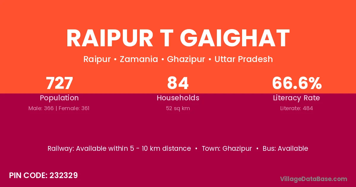 Raipur T Gaighat village has a total population of 727 people, of which 366 are males and 361 are females.