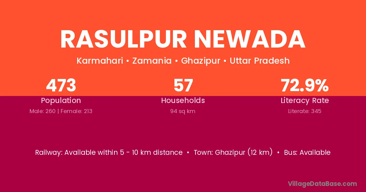 Rasulpur Newada village has a total population of 473 people, of which 260 are males and 213 are females.