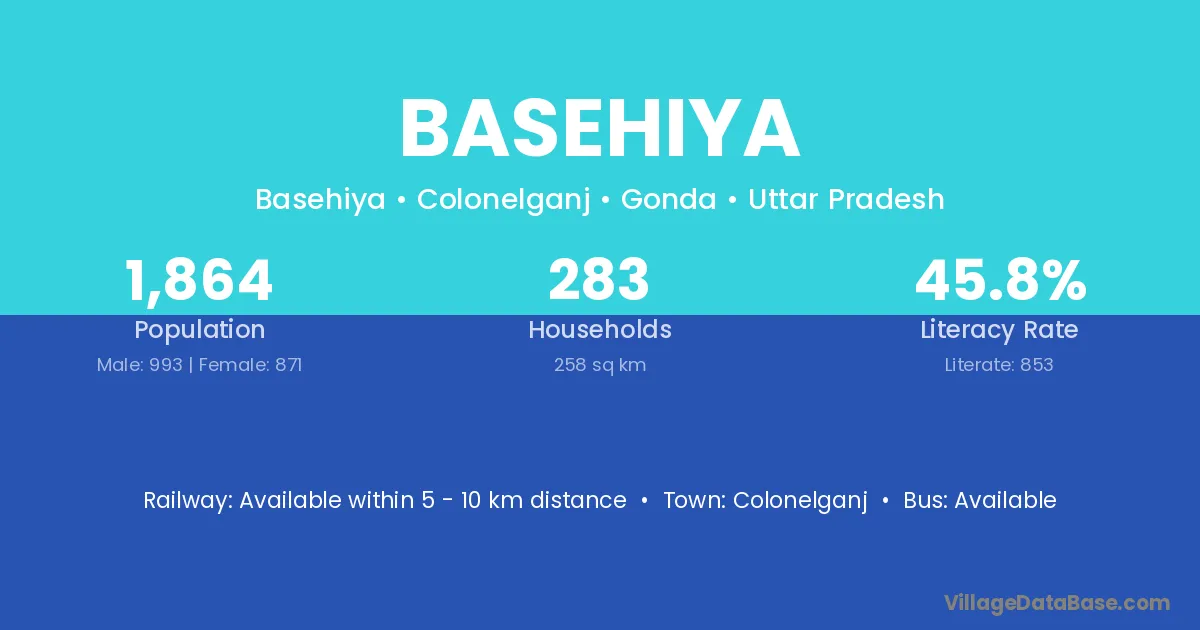 Basehiya village has a total population of 1,864 people, of which 993 are males and 871 are females.