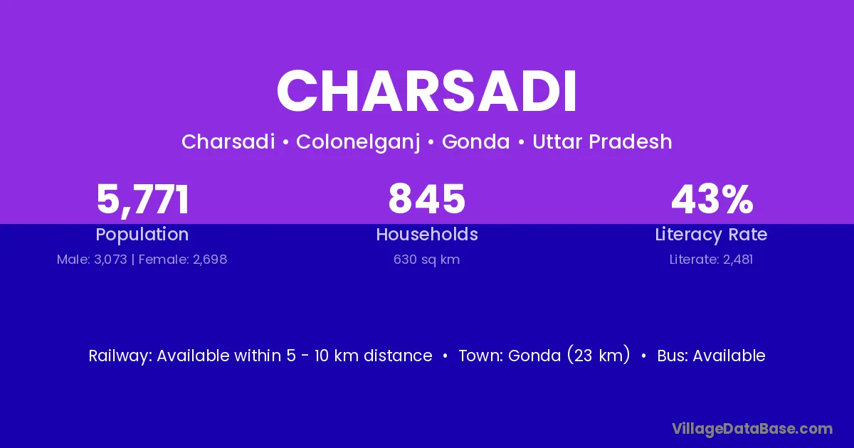 Gonda (23 km) is the nearest town to Charsadi village for major economic activities and is located approximately 23 km away.