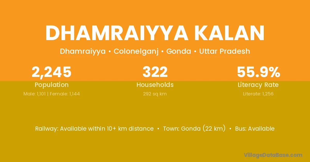 Gonda (22 km) is the nearest town to Dhamraiyya Kalan village for major economic activities and is located approximately 22 km away.