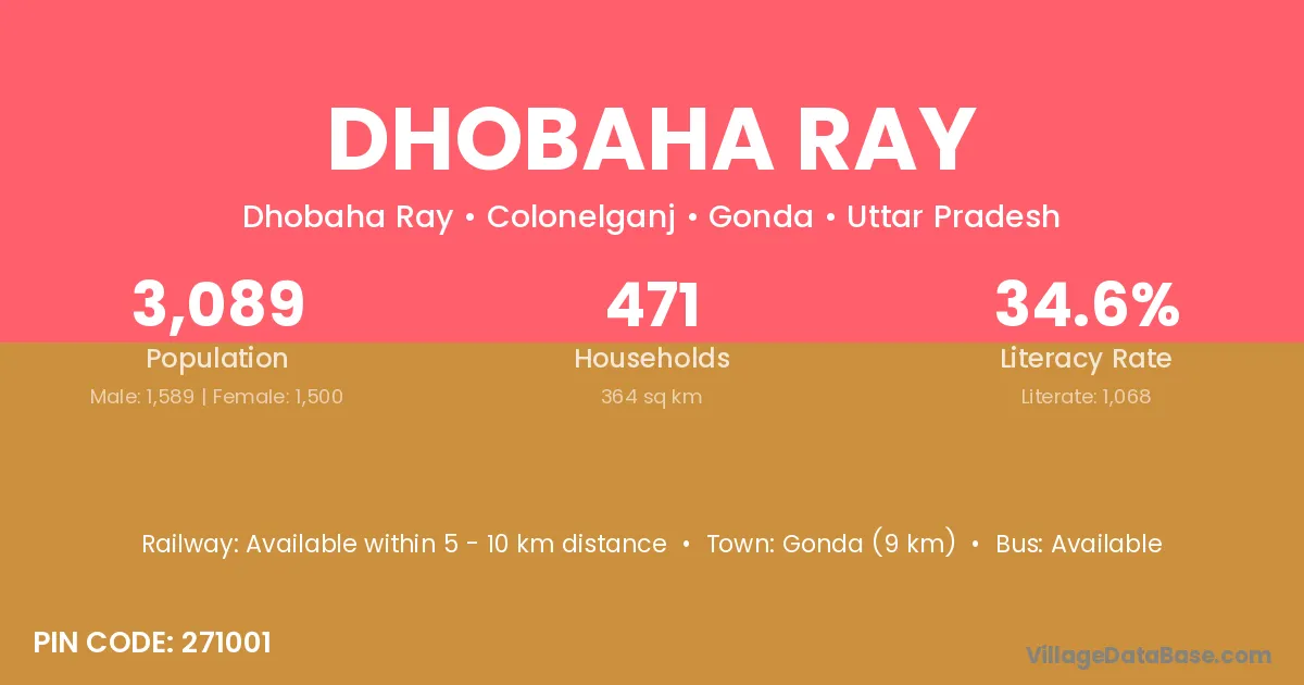 Gonda (9 km) is the nearest town to Dhobaha Ray village for major economic activities and is located approximately 9 km away.