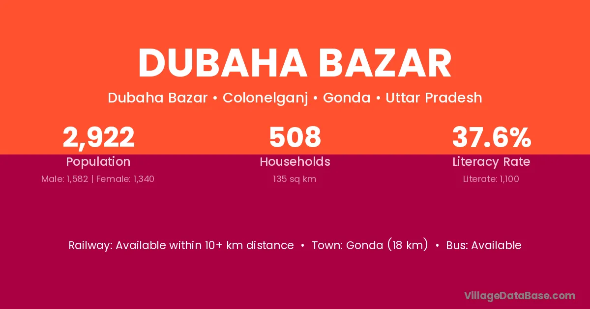 Gonda (18 km) is the nearest town to Dubaha Bazar village for major economic activities and is located approximately 18 km away.