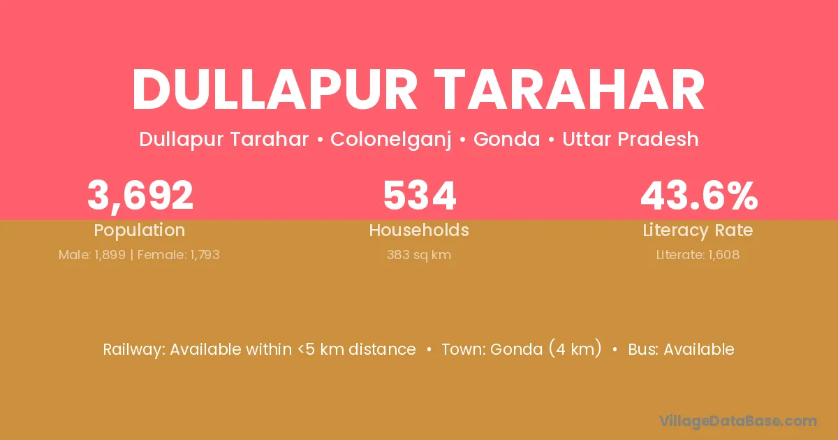 Gonda (4 km) is the nearest town to Dullapur Tarahar village for major economic activities and is located approximately 4 km away.