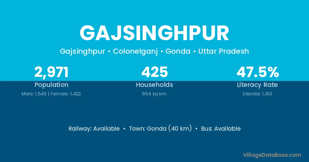 Gonda (40 km) is the nearest town to Gajsinghpur village for major economic activities and is located approximately 40 km away.