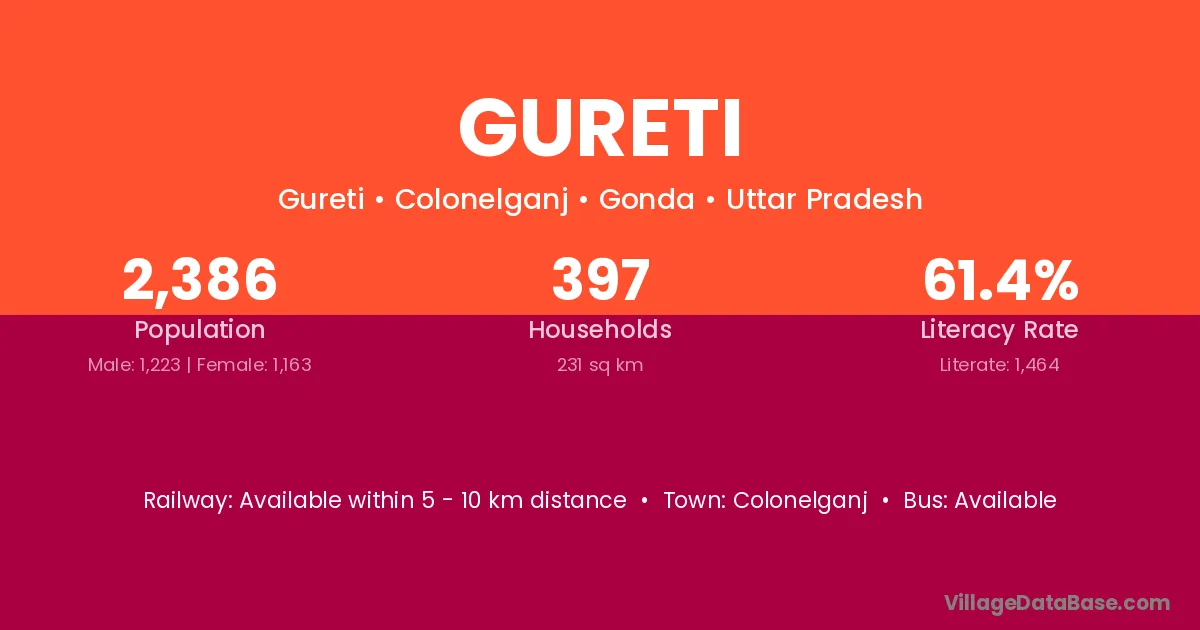 Gureti village has a total population of 2,386 people, of which 1,223 are males and 1,163 are females.