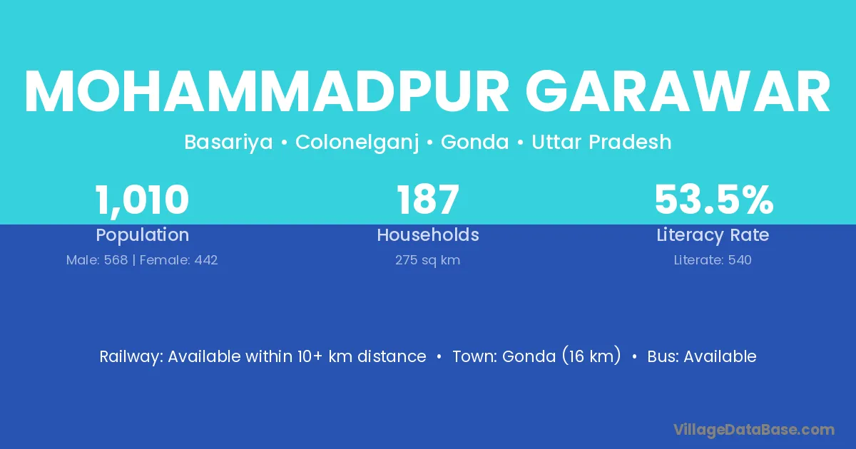 Gonda (16 km) is the nearest town to Mohammadpur Garawar village for major economic activities and is located approximately 16 km away.