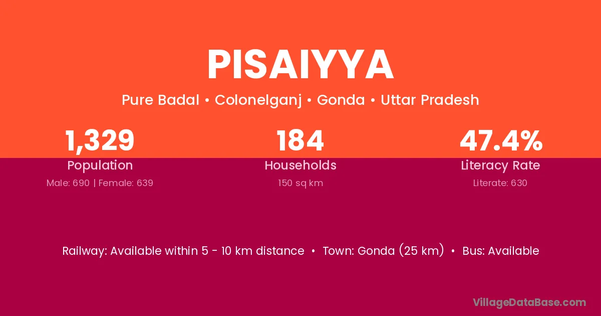 Gonda (25 km) is the nearest town to Pisaiyya village for major economic activities and is located approximately 25 km away.