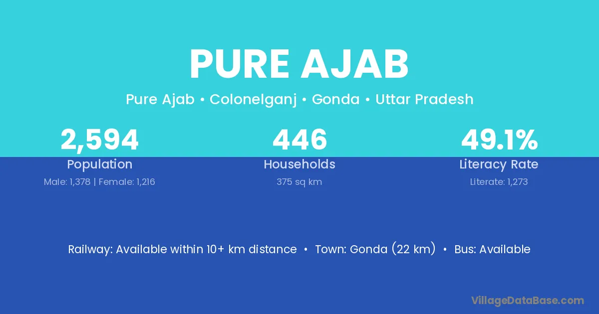 Gonda (22 km) is the nearest town to Pure Ajab village for major economic activities and is located approximately 22 km away.