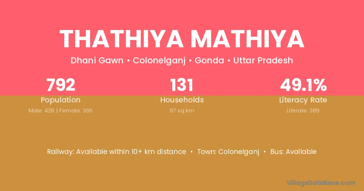Thathiya Mathiya village has a total population of 792 people, of which 426 are males and 366 are females.