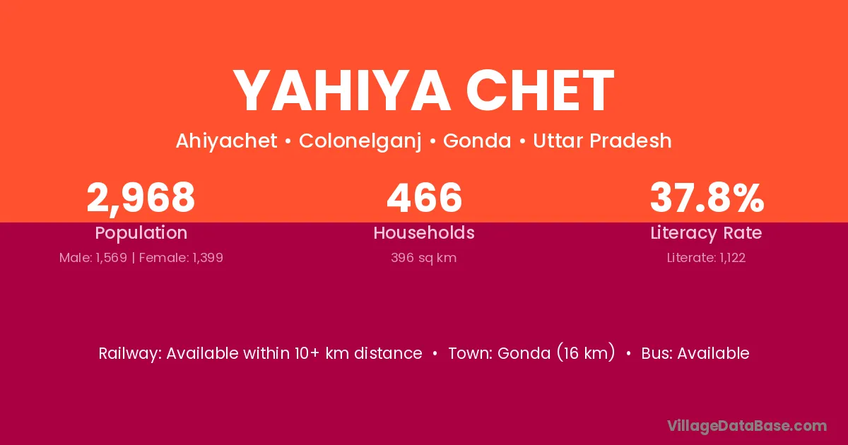 Gonda (16 km) is the nearest town to Yahiya Chet village for major economic activities and is located approximately 16 km away.