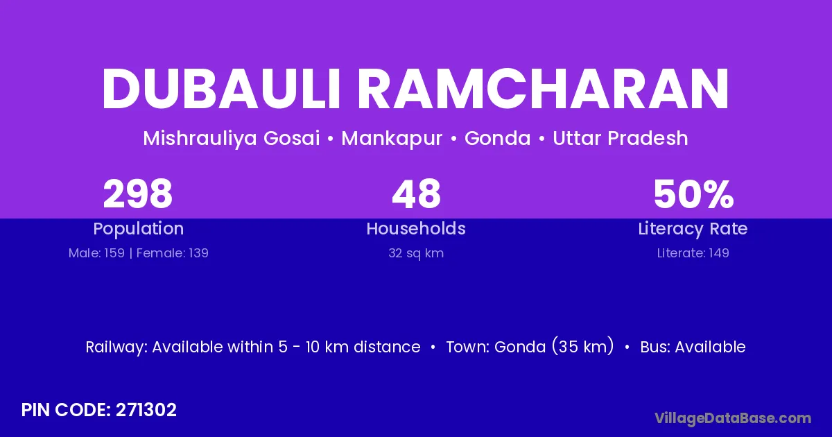 Gonda (35 km) is the nearest town to Dubauli Ramcharan village for major economic activities and is located approximately 35 km away.