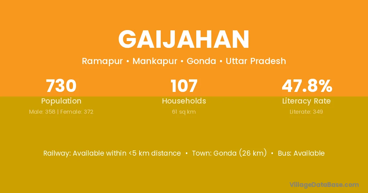 Gonda (26 km) is the nearest town to Gaijahan village for major economic activities and is located approximately 26 km away.