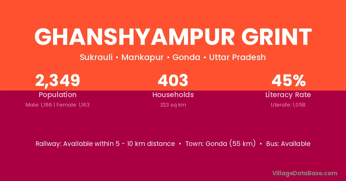 Gonda (55 km) is the nearest town to Ghanshyampur Grint village for major economic activities and is located approximately 55 km away.