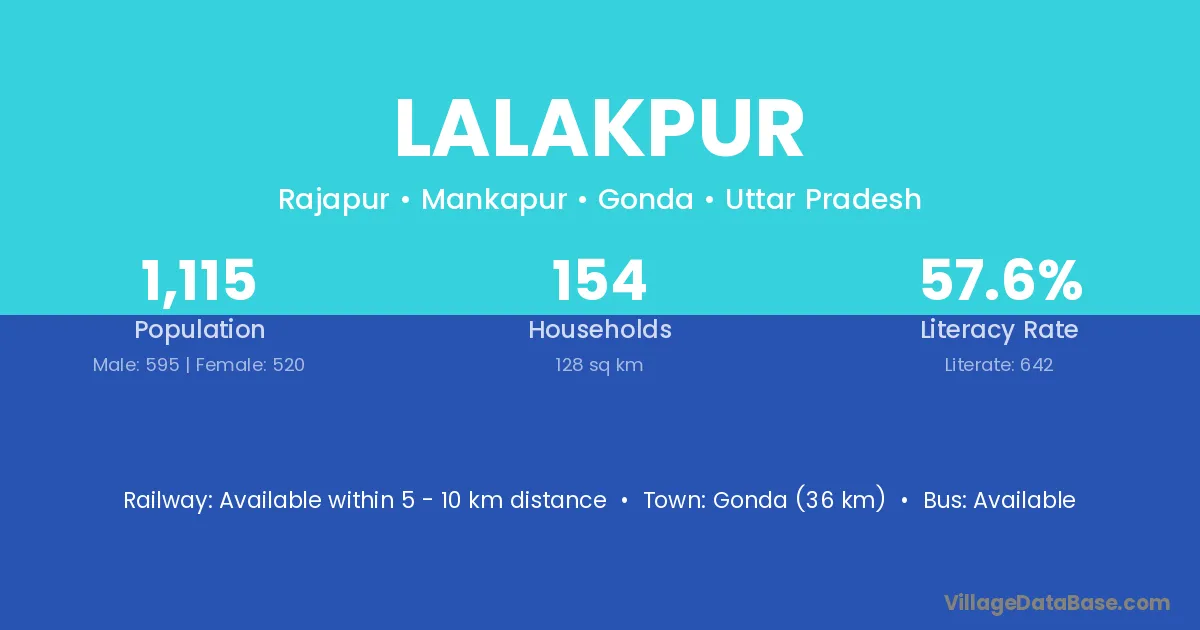 Gonda (36 km) is the nearest town to Lalakpur village for major economic activities and is located approximately 36 km away.