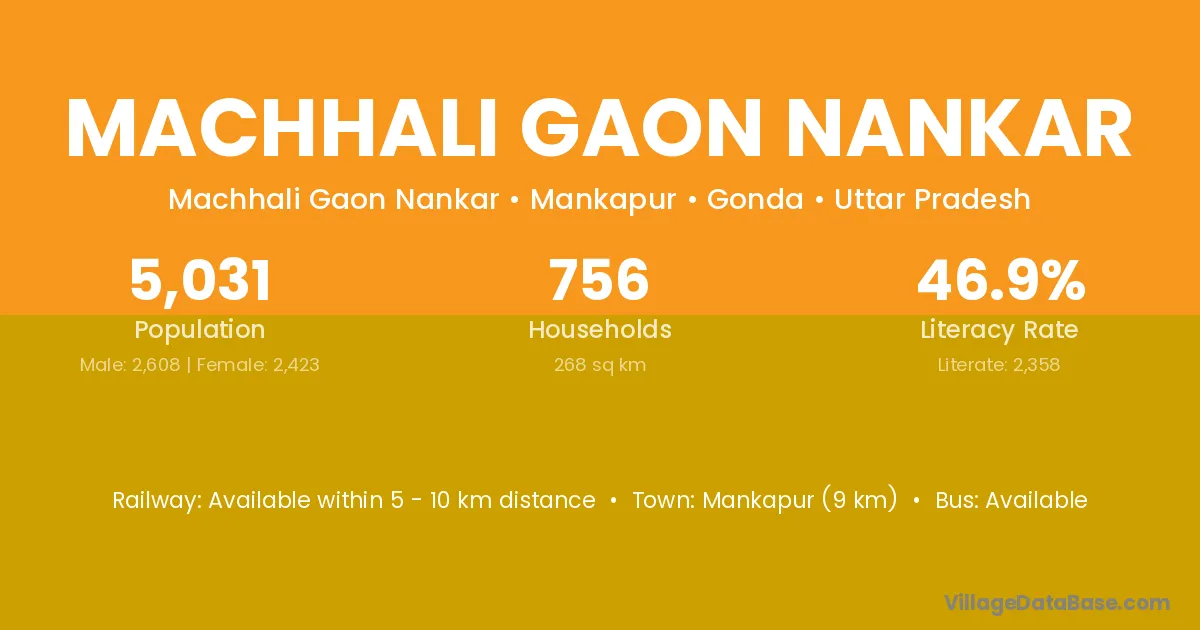Machhali Gaon Nankar village has a total population of 5,031 people, of which 2,608 are males and 2,423 are females.