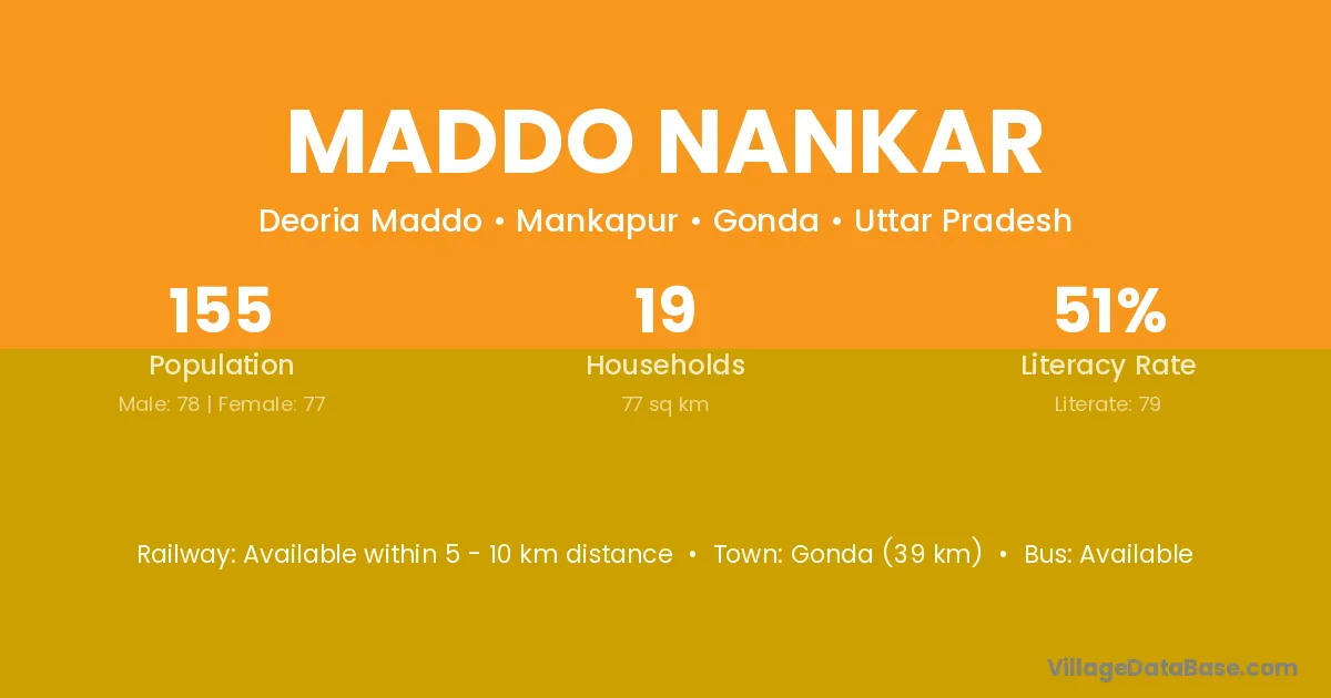 Gonda (39 km) is the nearest town to Maddo Nankar village for major economic activities and is located approximately 39 km away.