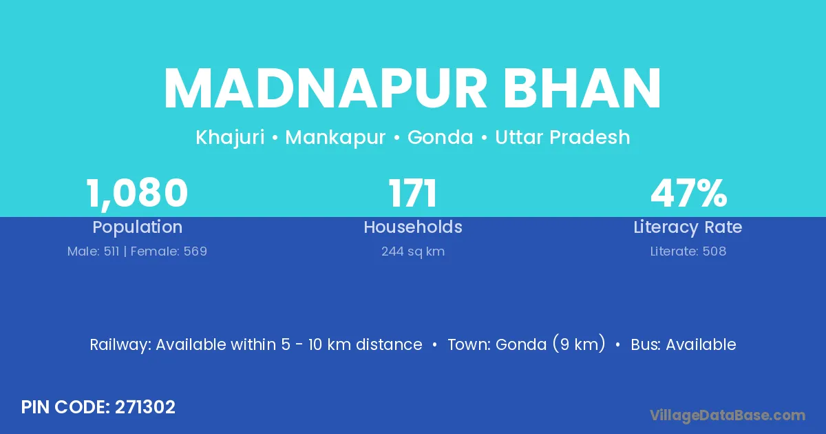 Gonda (9 km) is the nearest town to Madnapur Bhan village for major economic activities and is located approximately 9 km away.